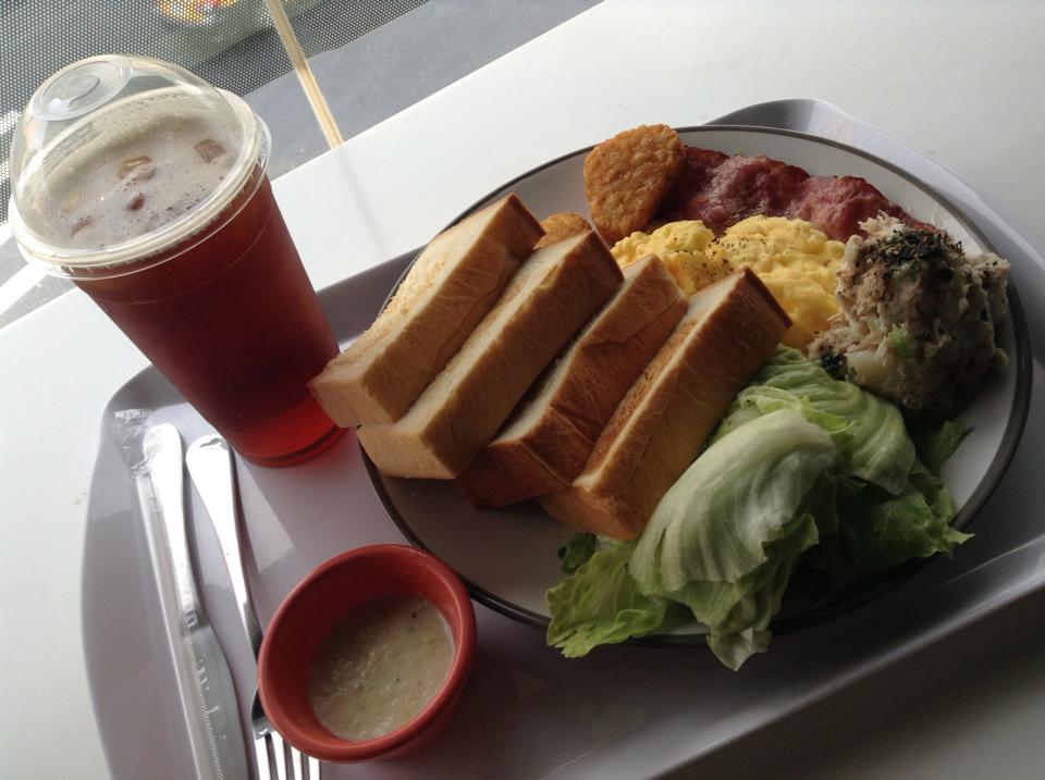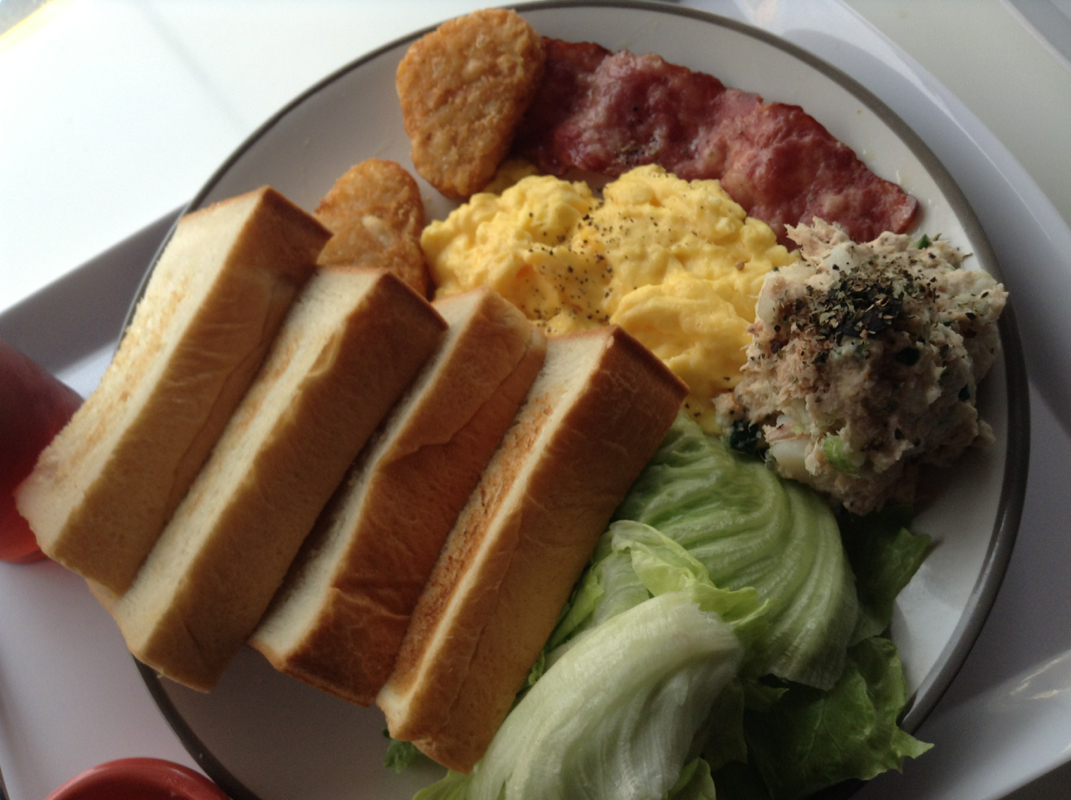 這盤內容物包含四片吐司、煎蛋、兩塊小薯餅、培根、生菜、鮪魚沙拉